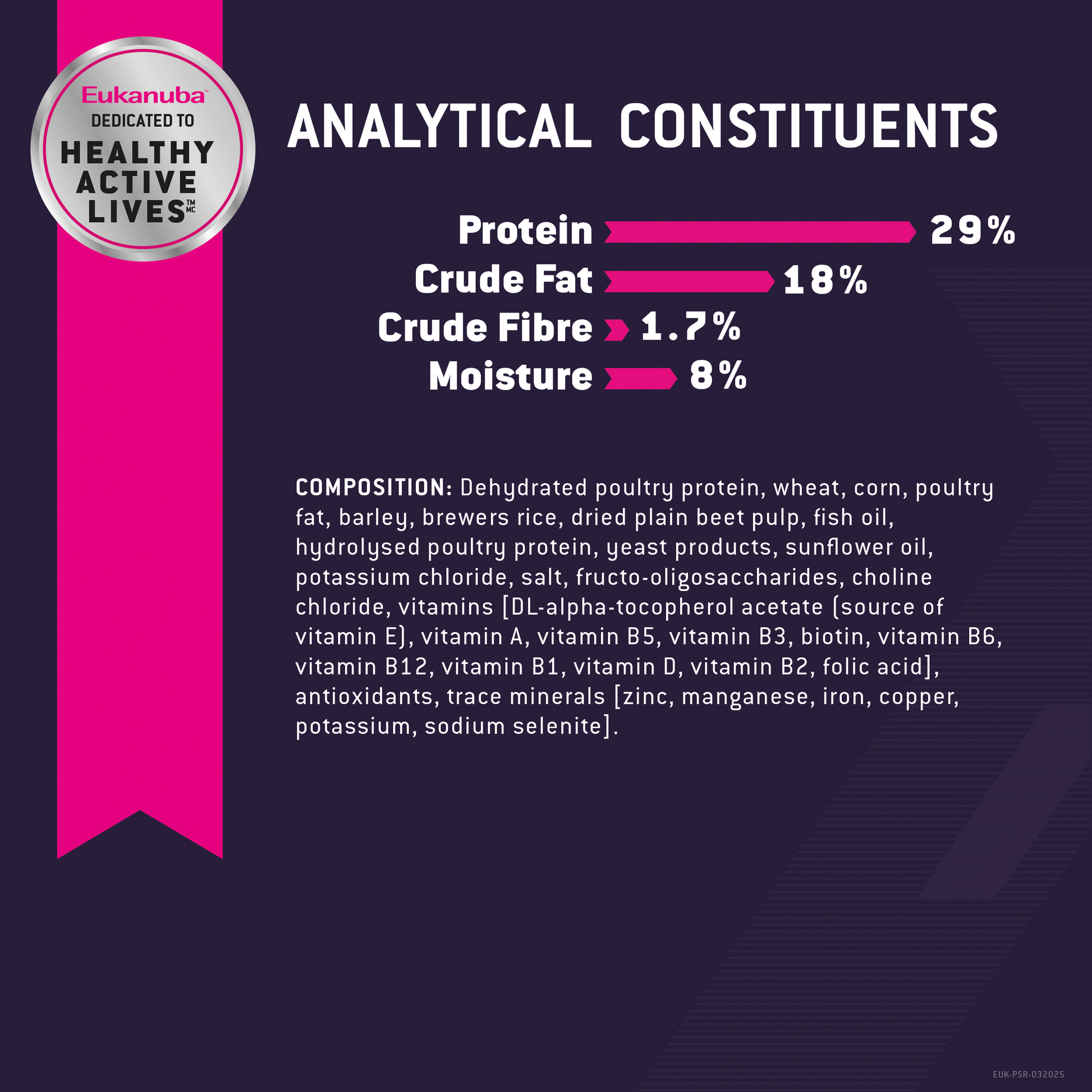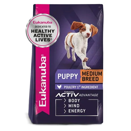 Eukanuba™ Puppy Medium Breed Dry Dog Food offers optimal nutrition for puppies of medium-sized breeds (adult weight 11kg to 24kg). With carefully balanced energy levels, calcium, and phosphorus, this formula supports optimal bone and muscle development. It features high-quality ingredients, including poultry protein as the first ingredient, along with fats, carbohydrates, fibres, and essential vitamins and minerals, ensuring a healthy start for your growing puppy.