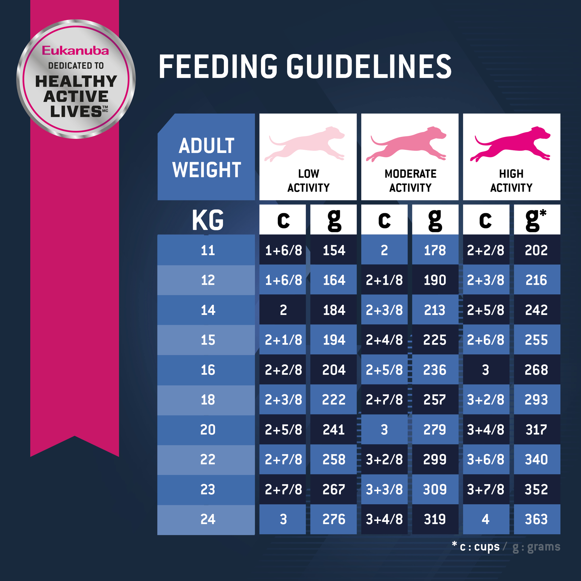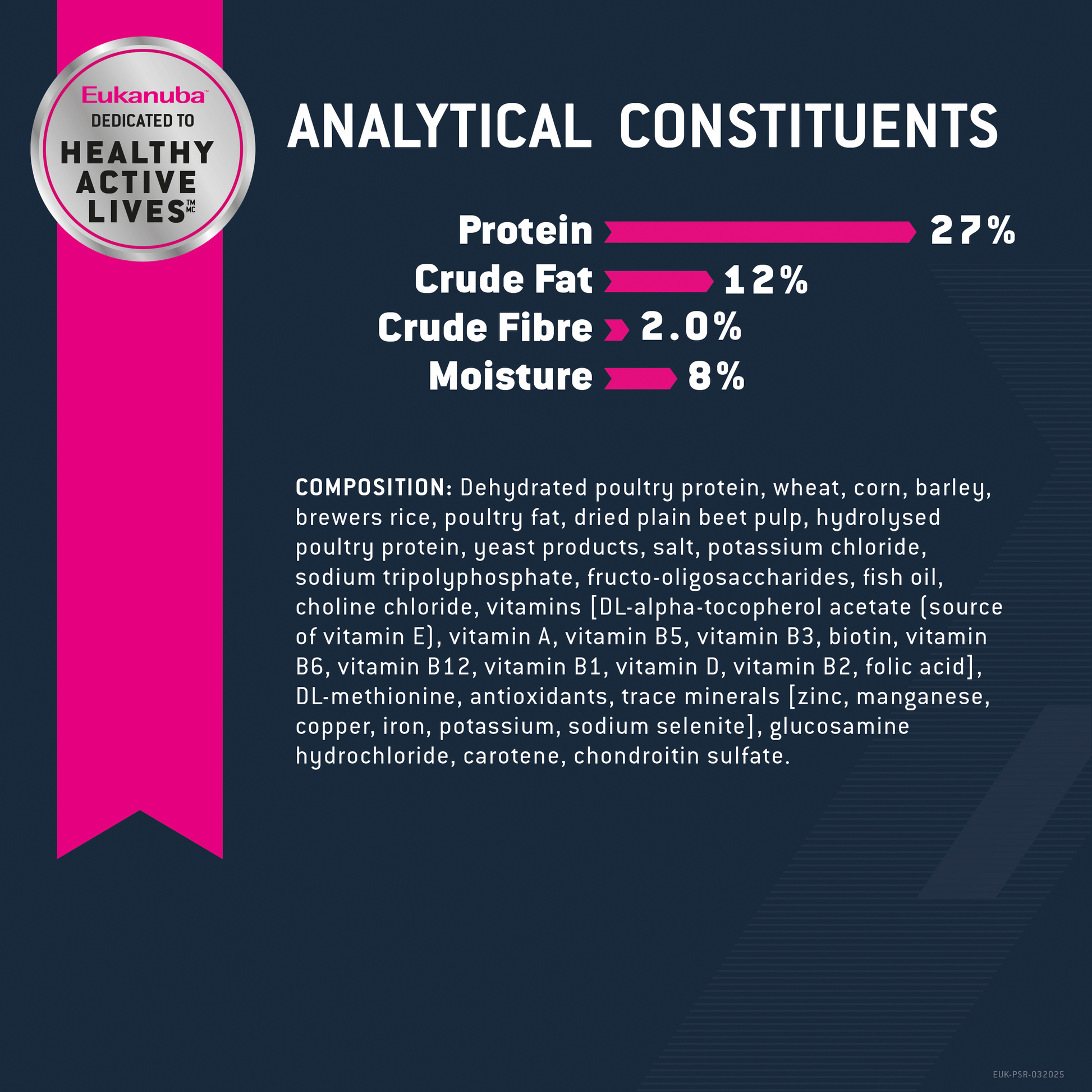 Eukanuba Mature & Senior Medium Breed provides optimal nutrition for medium dogs (10 - 25 kg) aged 7 years onwards. Formulated to address the special nutritional needs of ageing medium breed dogs such as weight control, joint health, skin and coat, dental health and immunity. It also contains a carbohydrate blend scientifically proven to provide sustained energy helping maintain healthy activity levels. It contains high quality animal based protein, (chicken is our No 1 ingredient), fat, carbohydrate, fibres and important vitamins and minerals for the health and well-being of your aging dog.