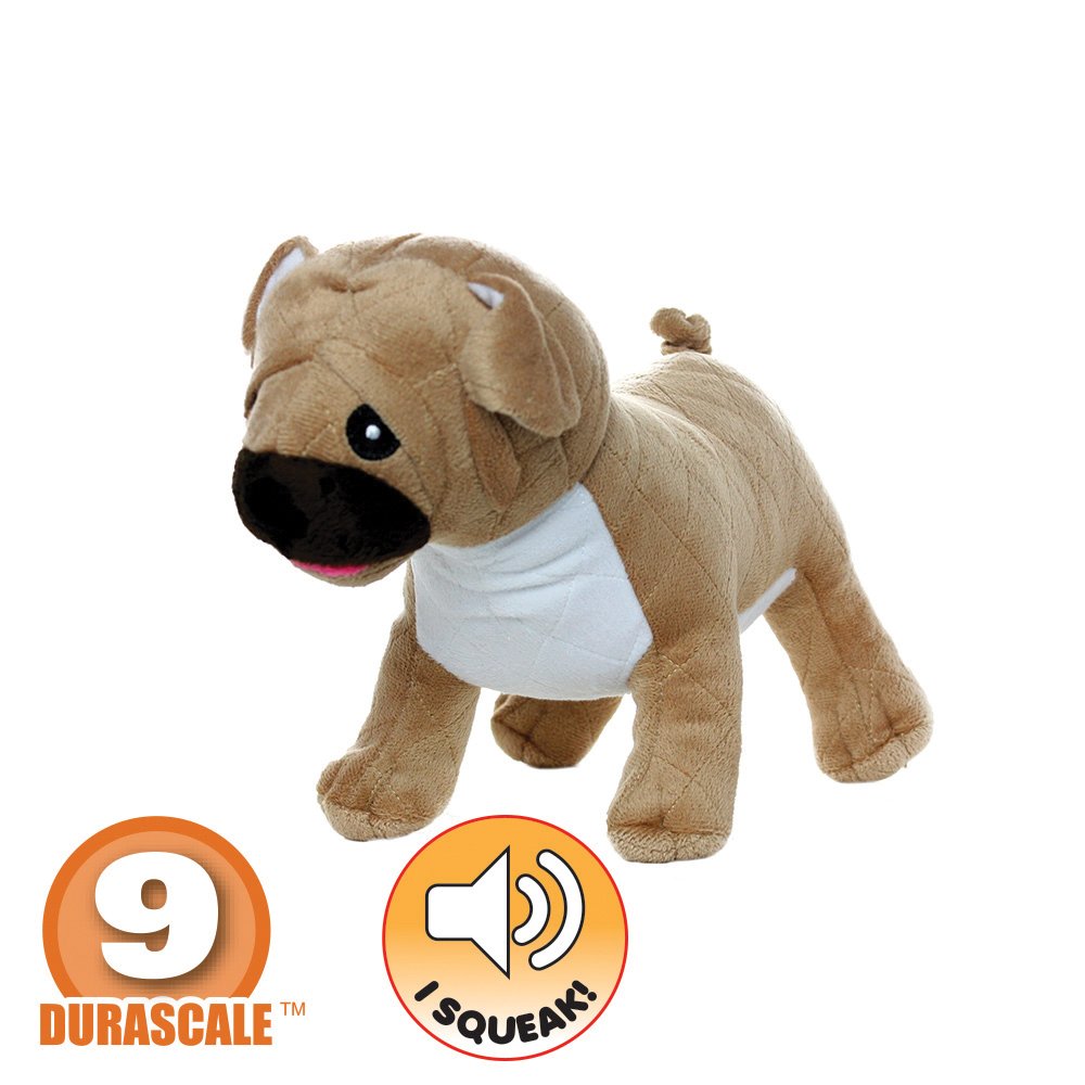 Tuffy Mighty dog toys are made with up to 2 layers of material consisting of 1 layer of soft plush on the outside and 1 layer of soft non woven fleece on the inside. The non woven fleece is not easily punctured by dog's teeth and moves with the action of the jaw. This protects the plush from being ripped or torn easily and makes a toy that will last a lot longer. All of the toy layers are sewn together multiple times to make one super strong layer of material. Each toy is sewn together with 2 rows of cross stitching and 2 rows of linear stitching for added durability. Some of the Tuffy Mighty plush dog toys have one or multiple squeakers. Great for interactive play with one or multiple dogs. Best for dogs who like to whip their toys and play tug for hours. TUFFY toys float in water and are machine washable (air dry).