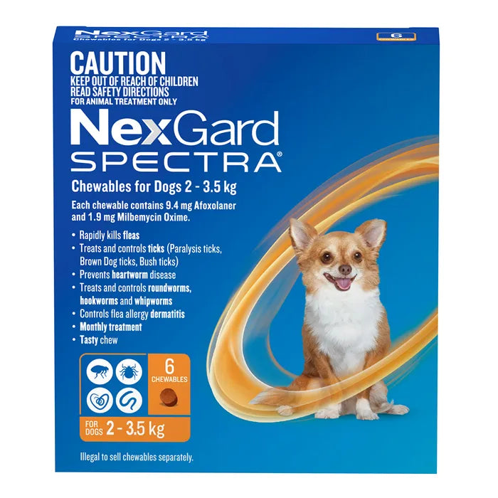 NexGard SPECTRA (Orange) is suitable for very small dogs from 1.35 - 3.5 kg in bodyweight.