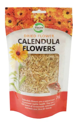 Dried Flower serves as a natural treat to enhance reptile health and well-being, contributing to the strengthening and support of the digestive and immune systems. Calendula, in particular, provides a broad spectrum of vitamins, minerals, antioxidants, nutrients, and high fiber content. Pisces Dried Flower is suitable for a variety of reptiles, including bearded dragons and blue tongue lizards. Additionally, it proves beneficial for small animals such as guinea pigs, rabbits, poultry, and rats.