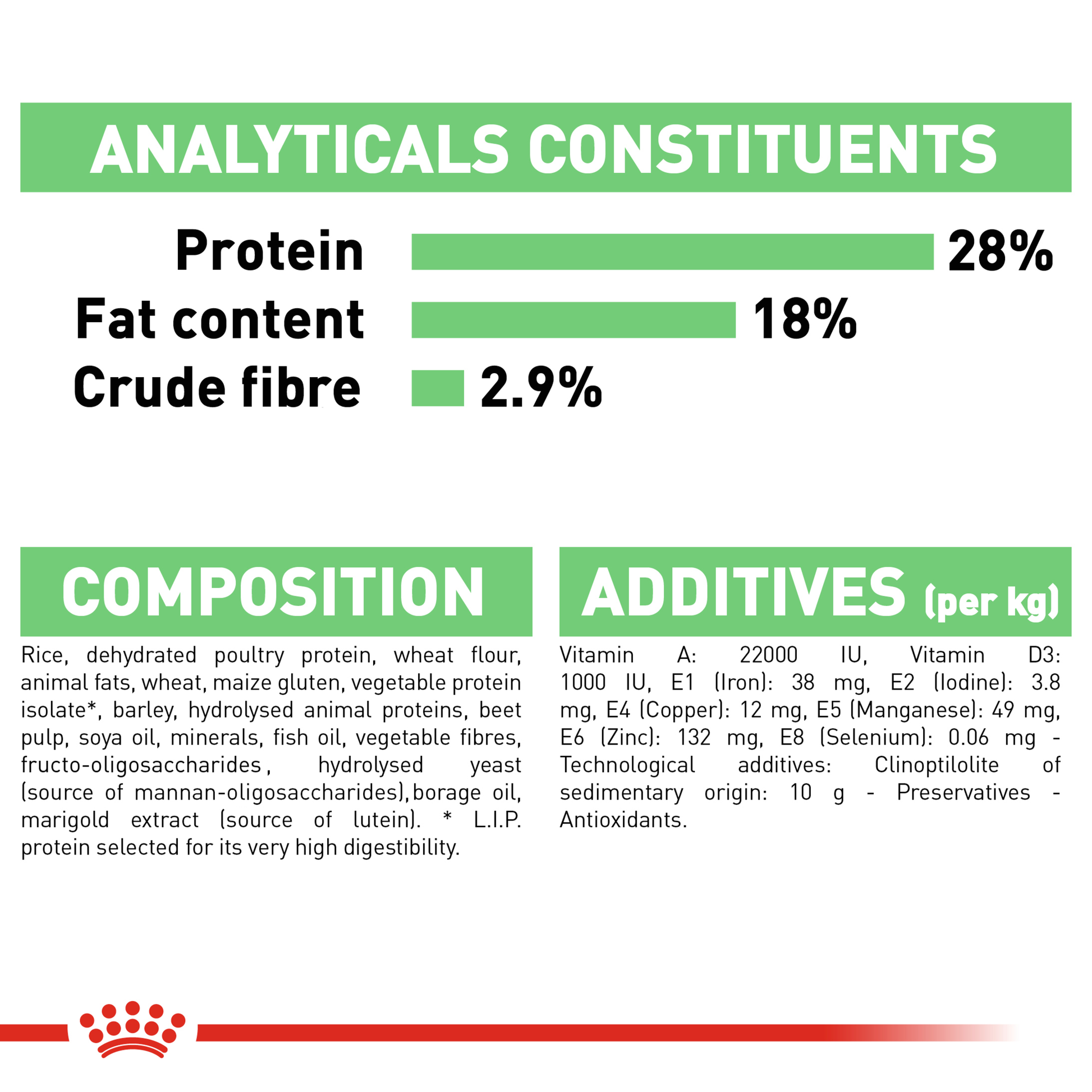 Suitable for dogs that weigh from 26kg to 44kg, ROYAL CANIN® Digestive Care Maxi is specially crafted for dogs prone to digestive sensitivity. ROYAL CANIN® Digestive Care Maxi contains high-quality nutrients, balanced for intestinal comfort and better absorption. Its formula includes a blend of prebiotics and fibres for balanced intestinal flora and promotion of optimal stool quality. ROYAL CANIN® Digestive Care Maxi is specially formulated using our smart cooking technique, which ensure nutrients are made better available for digestion. What’s more, our regular, rigorous quality checks confirm the high digestibility of this food. Prebiotics are essential nutrients in this formula, as they feed the good bacteria in your dog’s intestines. Sometimes known as good gut flora, these bacteria have an important role in supporting your dog’s intestinal and overall health. Our Digestive Care nutritional program has two components available: crunchy kibble and a delicious pâté in a pouch, both are nutritionally complete and perfectly complement each other. Don’t just take our word for it, ROYAL CANIN® Digestive Care Maxi’s results boast up to 97% optimal stool quality development.