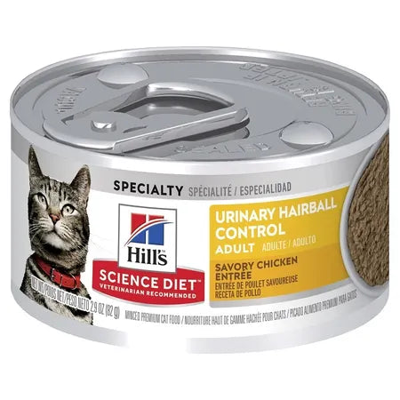 Hill's Science Diet Adult Urinary Hairball Control Savory Chicken Entrée provides nutrition to help avoid hairball formation for cats.