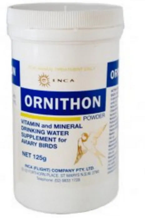 INCA Ornithon 125g is a vitamin and mineral supplement for birds. It provides birds with essential nutrients. It can be given to the birds by simply adding it to their drinking water. It helps to keep the health of the birds in good condition and is suitable for aviary birds like canaries, budgerigars, finches, quail parrots, cockatoos, and doves.